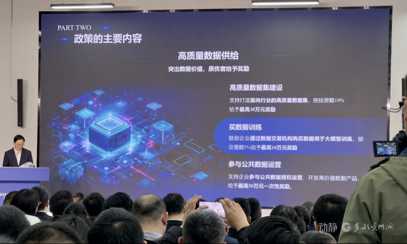 会上发布了《贵阳市支持数据产业发展的若干措施(试行)》,该政策围绕数据供给、技术创新、场景应用等7个方面,设定了具体的奖励和补贴标准,为相关企业发展提供支持。贵州大数据集团、世纪恒通科技等6家企业,围绕各自在数据标注领域的需求和服务进行路演。