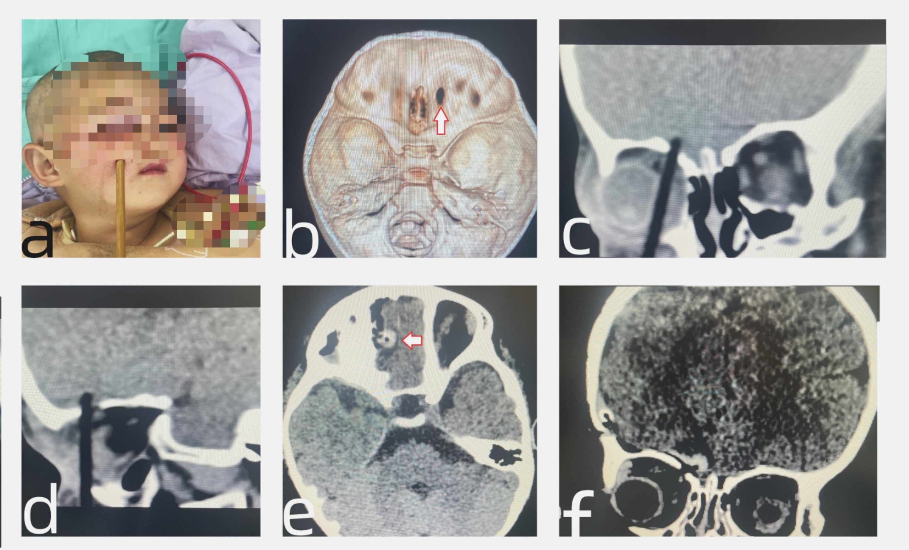 2岁患儿诺诺(化名)在吃饭时不慎摔倒,被筷子刺破右侧面颊,当即哭闹不止,右眼不能睁开,右侧眼睑及眶周肿胀、青紫,诺诺父母立即将孩子送往当地医院。颅脑显示,筷子竟已刺破诺诺的前颅底插入脑内。当地医生建议孩子到上级医院治疗,诺诺一家连夜赶往上海儿童医学中心贵州医院。