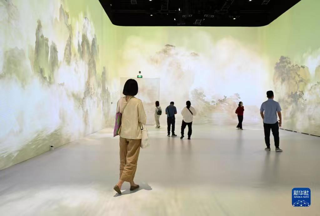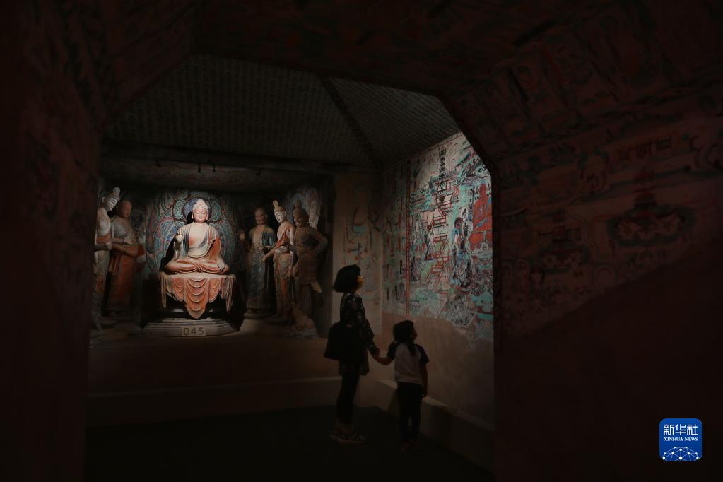 观众参观等比例高保真数字化3D打印复制的敦煌莫高窟第45窟