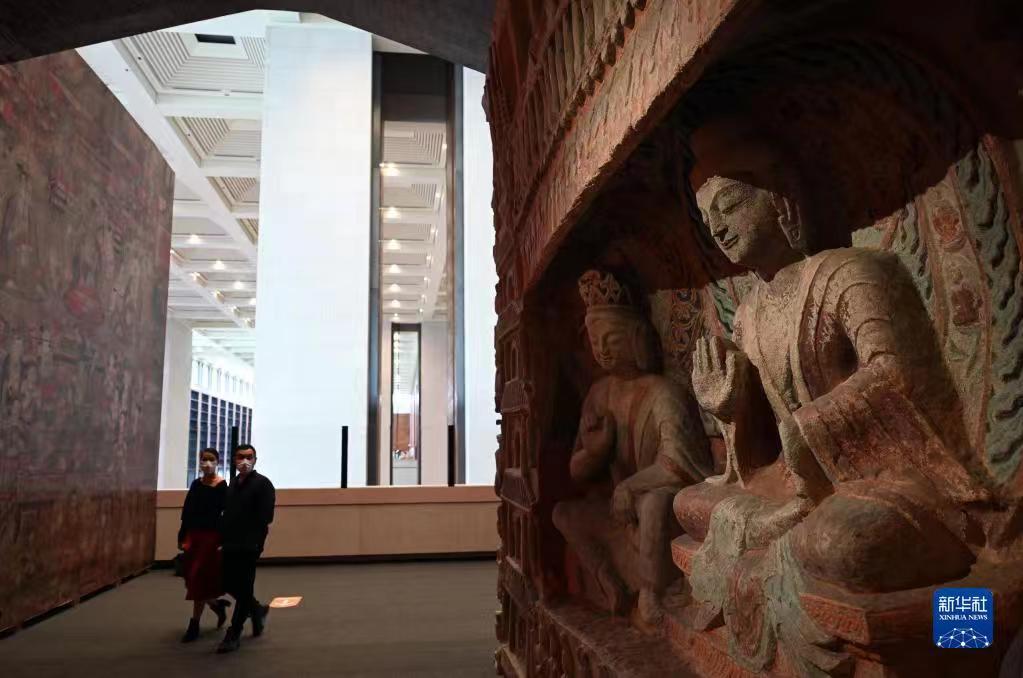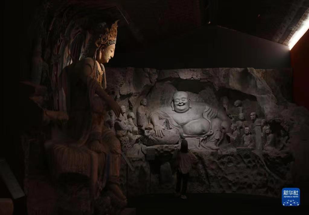 观众参观等比例高保真数字化3D打印复制的云冈石窟第6窟南壁“文殊问疾”屋形龛