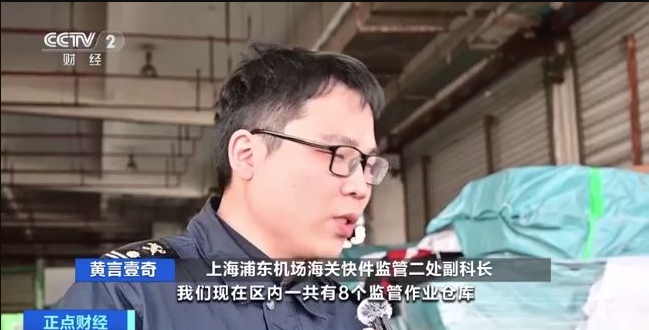 上海浦东机场海关快件监管二处副科长 黄言壹奇:区内一共有8个监管作业仓库,出口跨境电商货物非常多。从入库、操作到出库速度非常快,只需要4个小时就可以搭上航班离境。