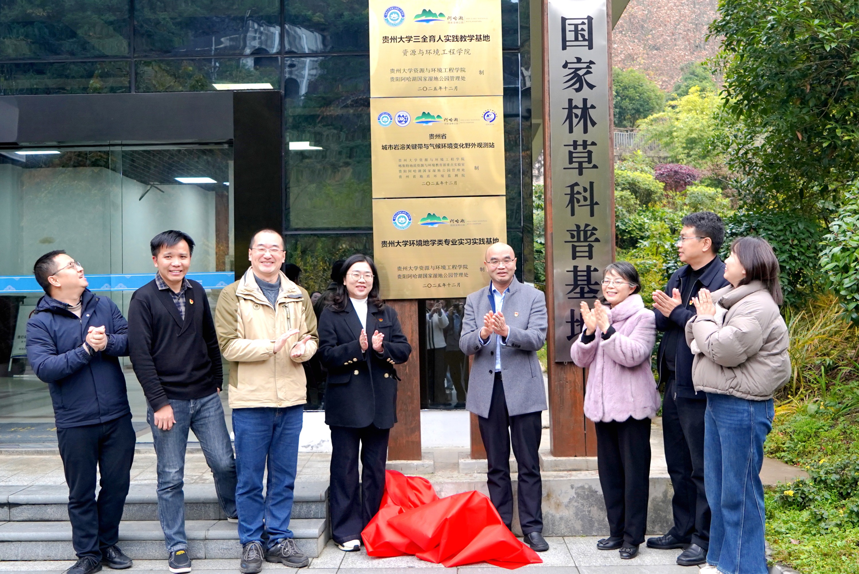 当天双方正式签订合作协议,并为“贵州省城市岩溶关键带与气候环境变化野外观测站”“贵州大学三全育人示范基地”“贵州大学环境地学类专业实习实践基地”揭牌。三大基地的落地,为贵州大学师生提供了集野外科研、实习实践、思政教育于一体的综合性平台。