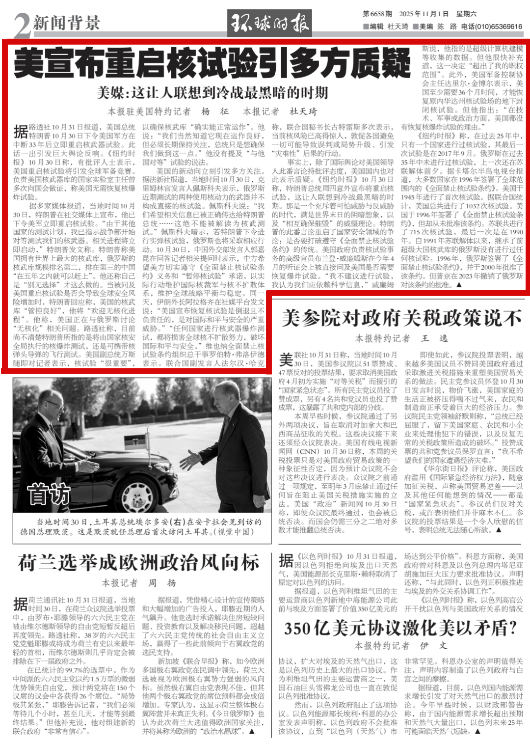 据路透社10月31日报道,美国总统特朗普10月30日下令美国军方在中断33年后立即重启核武器试验。此话一出引发巨大舆论反响。《纽约时报》10月30日称,有批评人士表示,美国重启核试验将引发全球军备竞赛。负责美国核武器库的国家实验室主任曾多次向国会做证,称美国无需恢复核爆炸试验。