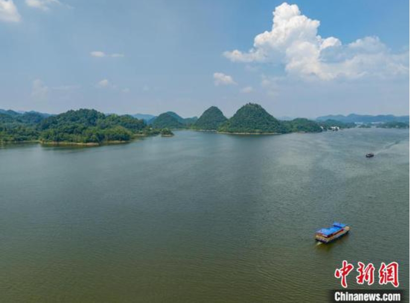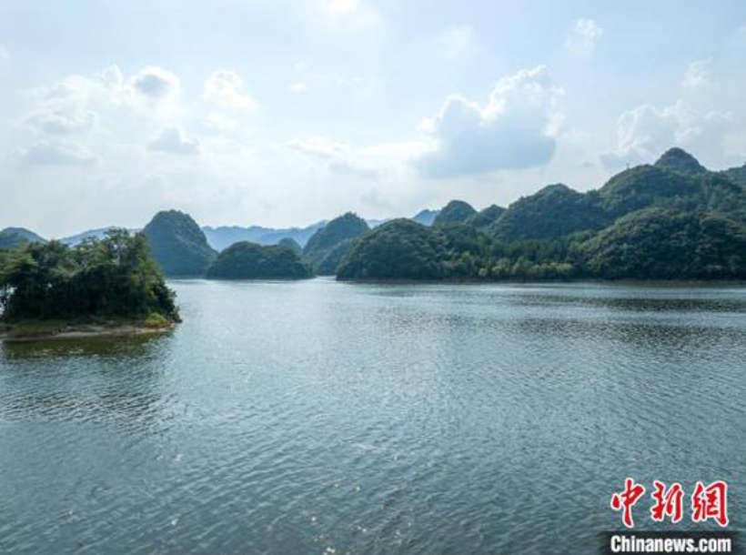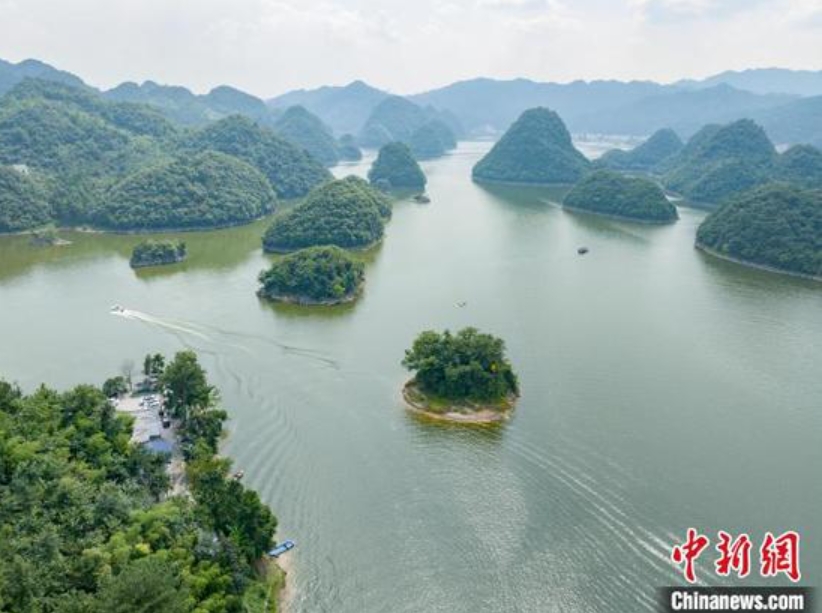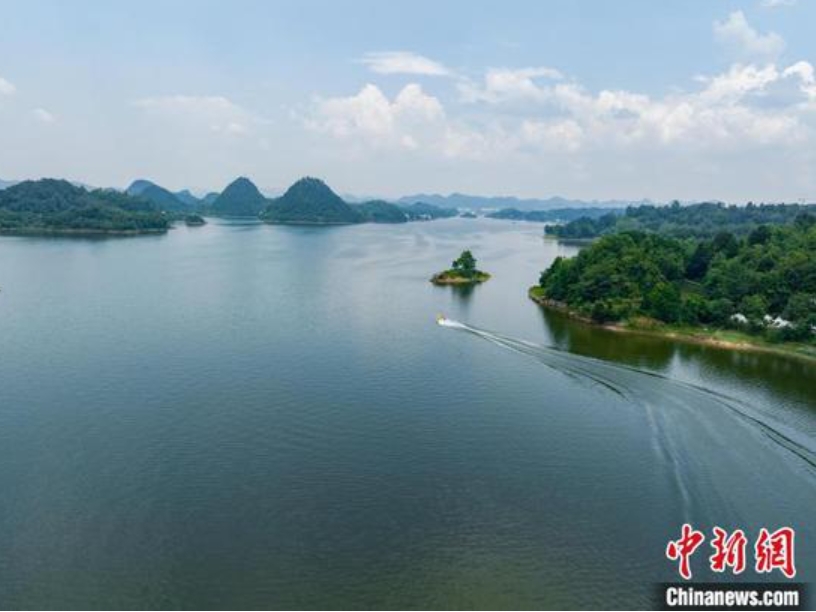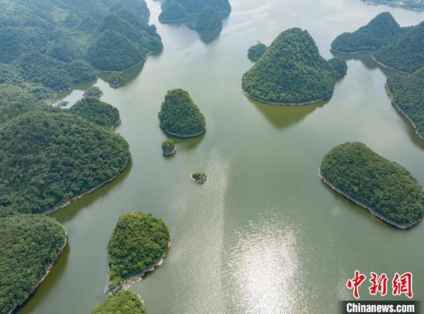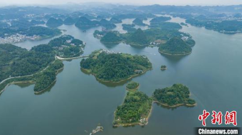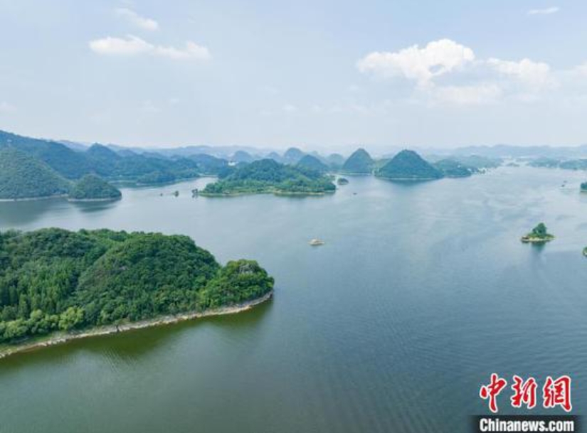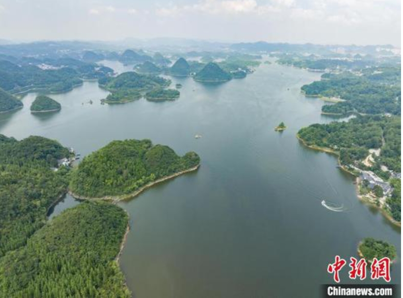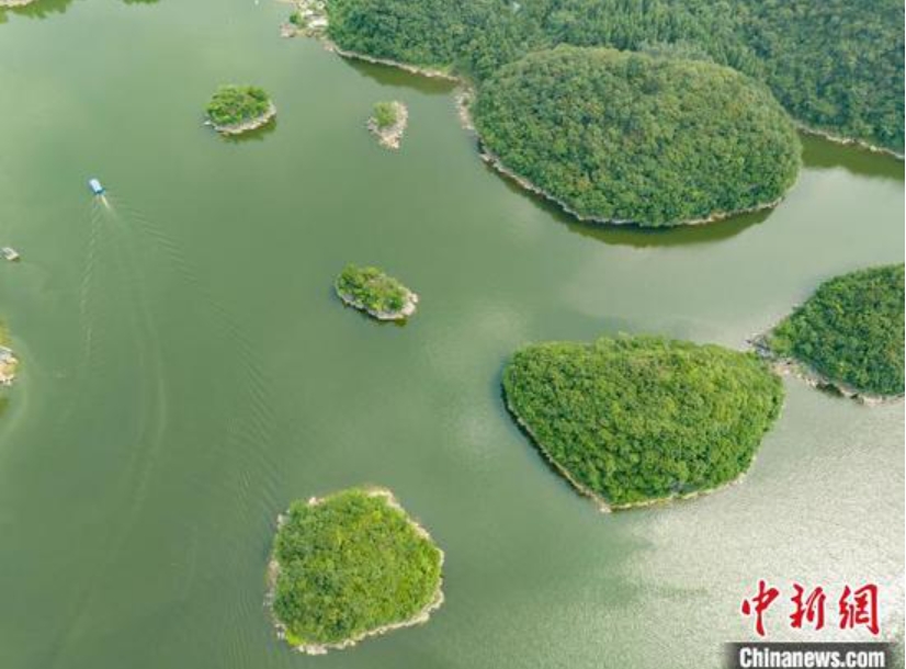 8月15日,全国生态日,航拍贵阳百花湖生态美。百花湖位于贵州省贵阳市观山湖区,是以高原喀斯特河谷型人工湖泊为主体,集湖泊、山岳、岛屿为一体,因湖中岛屿108个而得名。
