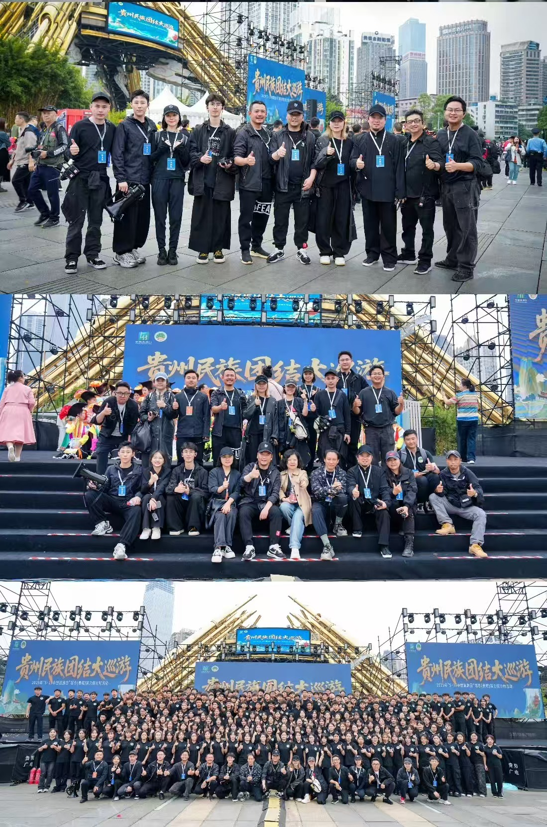 在“2025贵州民族团结大巡游”活动指挥部给导演组的感谢信中这样写道:五月的贵阳,繁花缀城、热情涌动。5月18日上午,2025年“5·19中国旅游日”城市(贵阳)接力倒计时活动——贵州民族团结大巡游圆满落幕,以鲜明的文旅体特色让贵州再度“破圈”,让多彩贵州的独特魅力与蓬勃活力传遍四方。这场盛会之所以能呈现震撼人心的文化感染力与视觉冲击力,核心离不开贵公司导演组的匠心创作与专业执导。从活动筹备到现场呈现,贵组始终以卓越的创意视野与严谨的执行能力,扛起文化表达的核心重任:总导演唐煌统筹全局,以深刻的文化洞察力挖掘贵州各民族文化精髓,将苗族银饰、侗族大歌、布依族蜡染等多元民族符号,转化为兼具艺术美感与叙事张力的巡游篇章;总执行唐康高效推进落地,精准协调各方资源,确保创意构想从图纸到现场的无缝衔接,每一个方阵的动线、每一段表演的节奏、每一处视觉的呈现,都凝聚着细致把控;杨荻、丁鹏凯、杨影、金贵芳、杨密、孙盈、赵亮、曹铮、叶新、杨冠卿、胡义群、吴姗姗、石可、白焱杰、吴宣佚、赵一锦等导演组成员各司其职,或深耕节目编排、或细化流程衔接、或优化现场调度,以专业素养与敬业精神,让“民族团结”的主题既庄重深刻又生动鲜活,让观众在沉浸式体验中读懂贵州的文化底蕴与团结力量。