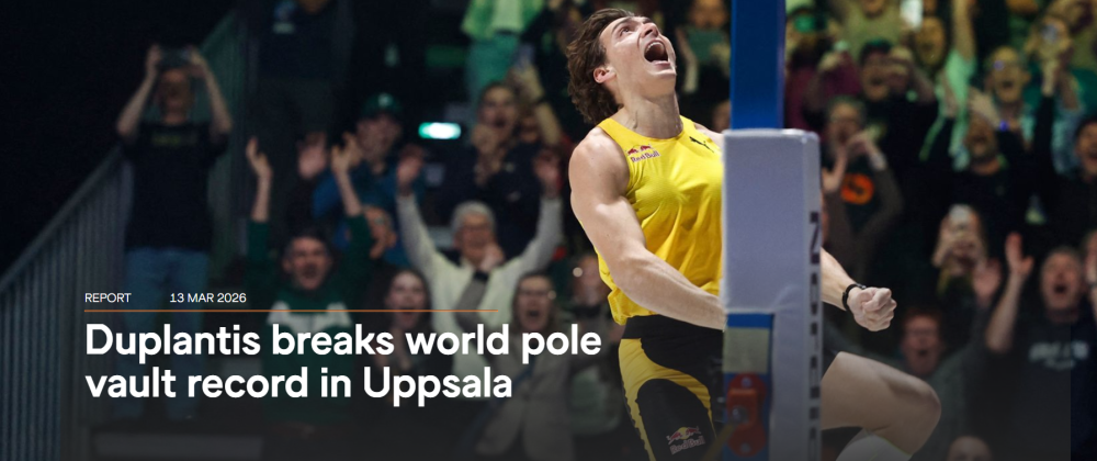 世界田联官网消息,当地时间12日在瑞典乌普萨拉进行的“蒙多经典赛”中,瑞典撑杆跳高名将杜普兰蒂斯成功跳过6米31的高度,将自己保持的世界纪录提升1厘米。这也是他职业生涯第15次刷新男子撑杆跳高世界纪录。