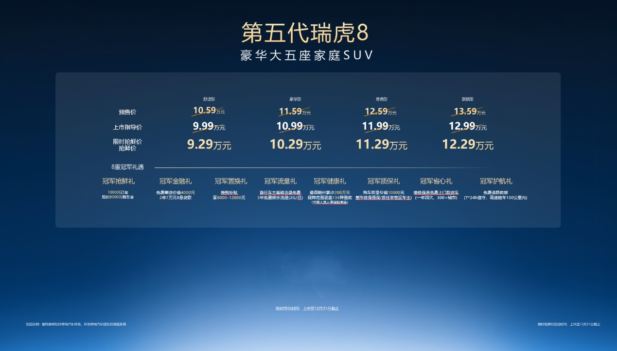 第五代瑞虎 8 诚意推出 8 重冠军礼遇,限时抢鲜价 9.29 万元起,让消费者购车更轻松、用车更省心!