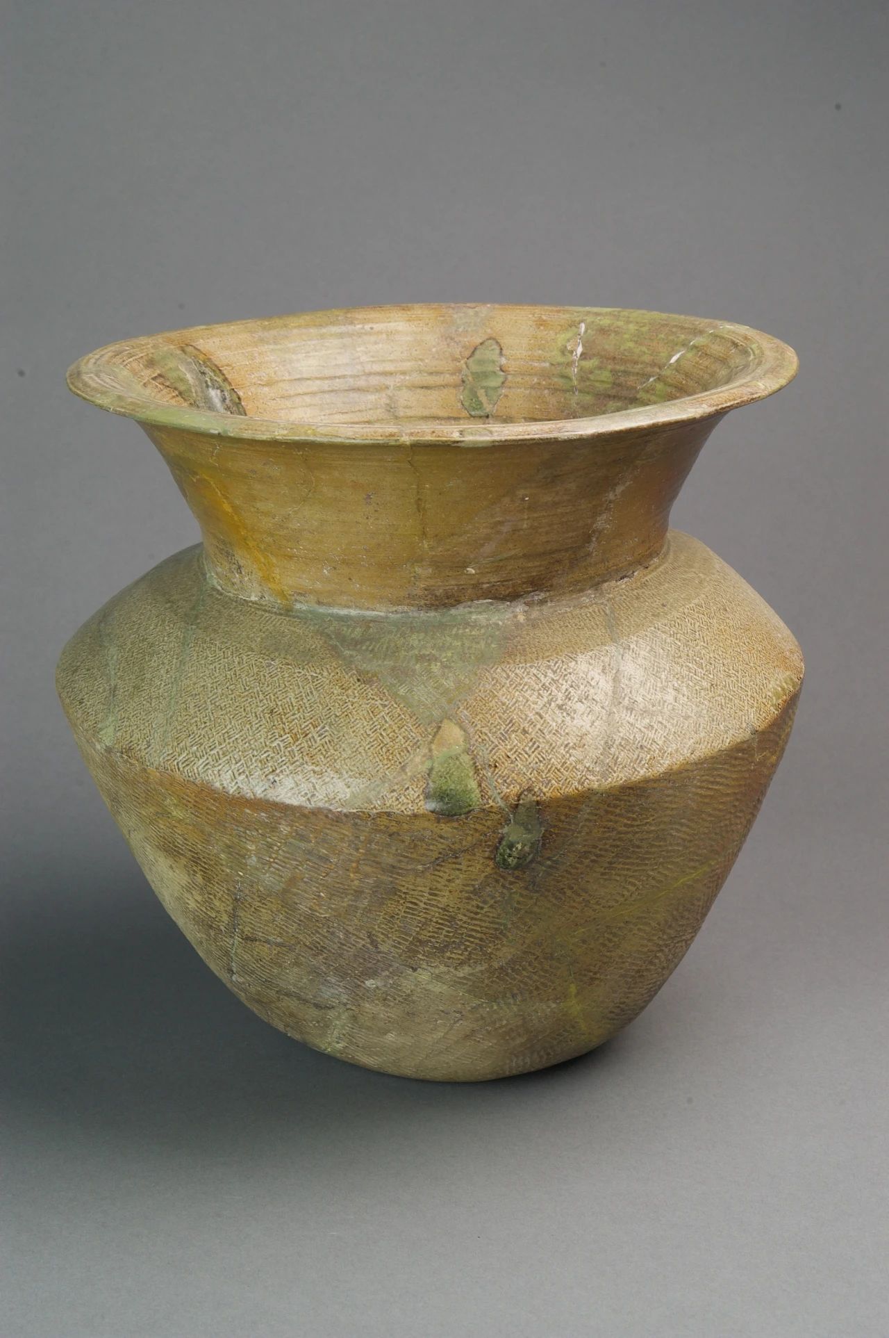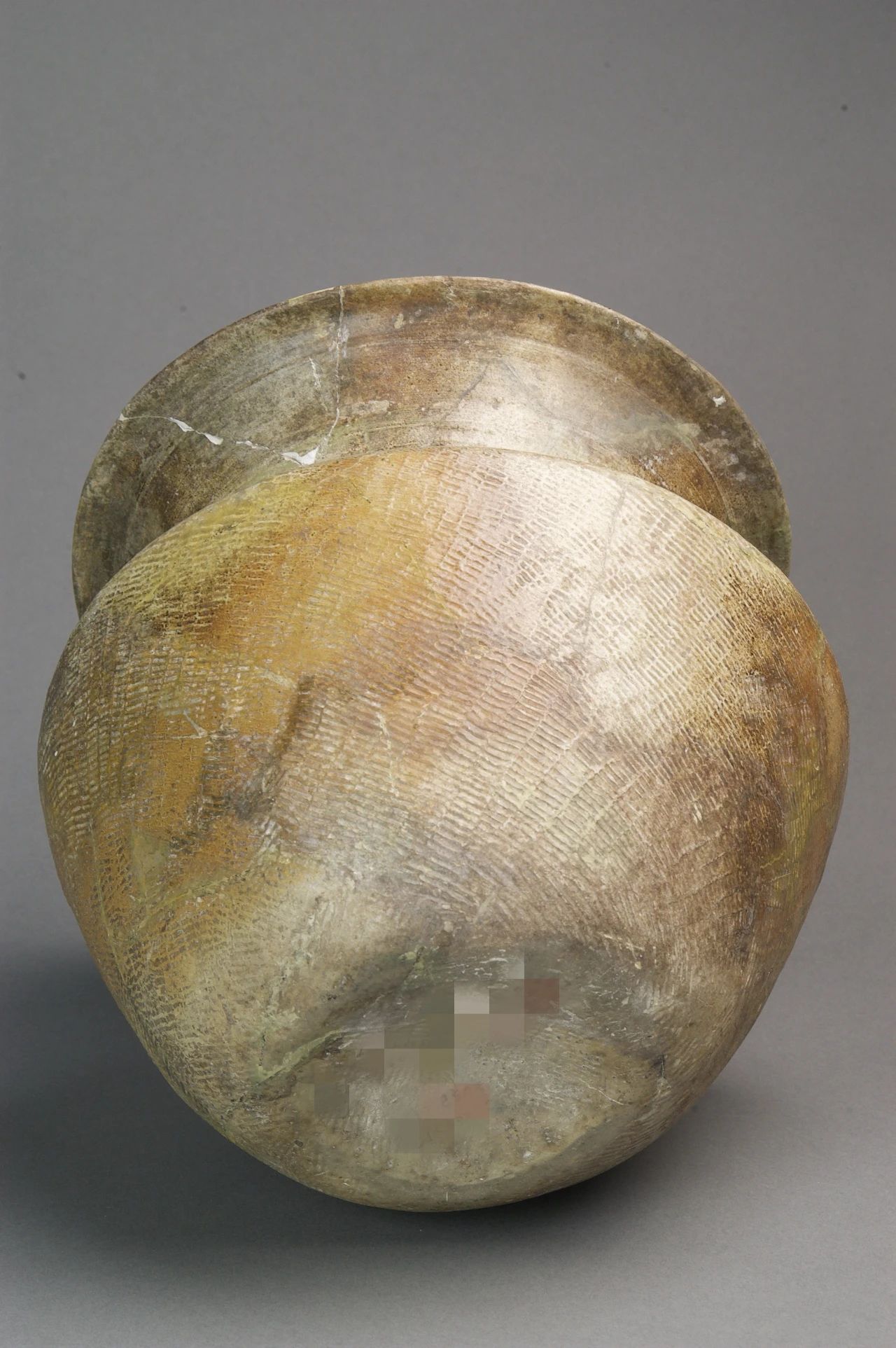 △ 青釉瓷尊肩部拍印席纹,腹部饰以条纹,纹饰清晰优美。