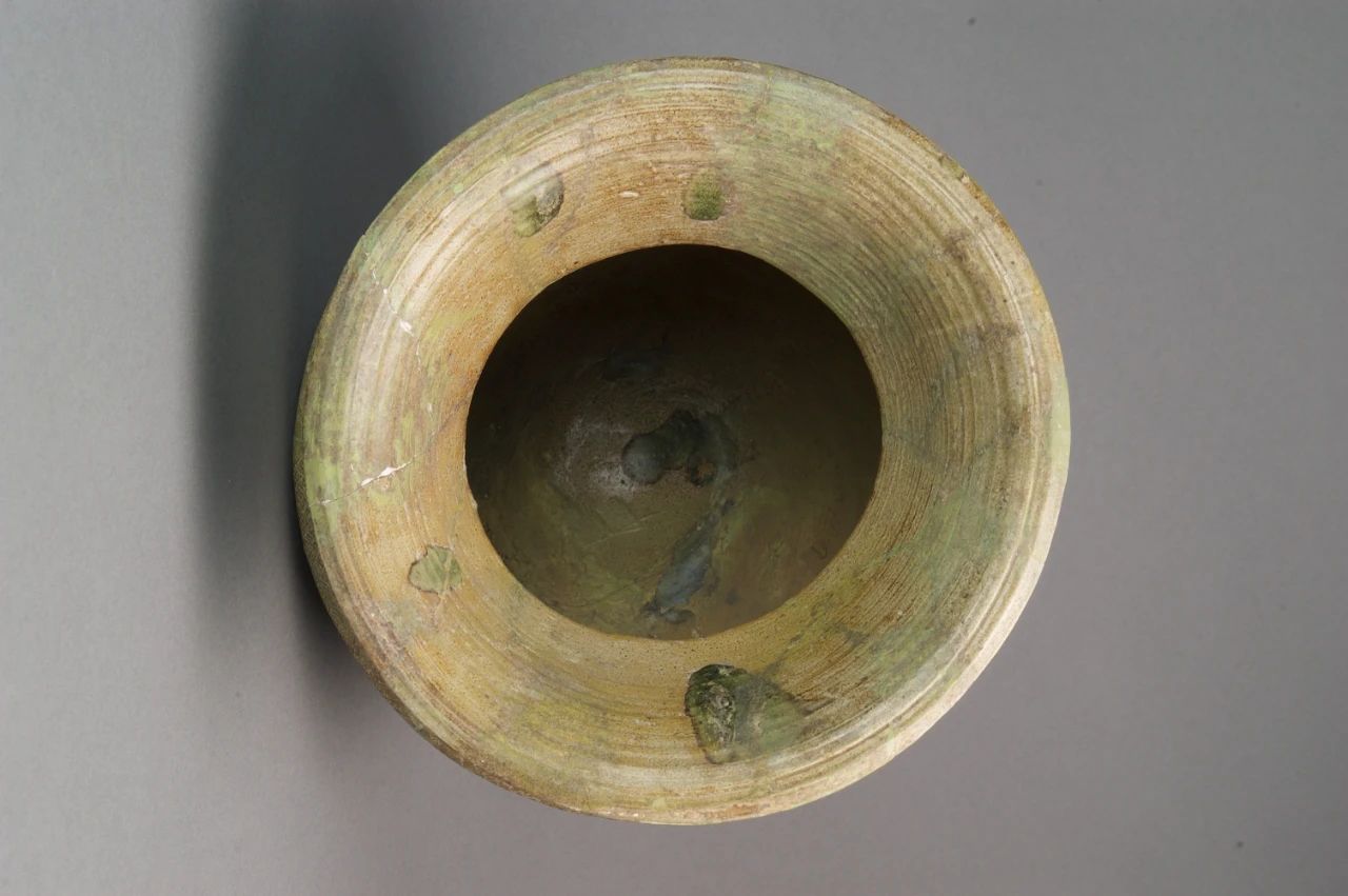 △ 青釉瓷尊俯视图,口沿部有泪痕状釉,泪痕呈深绿色