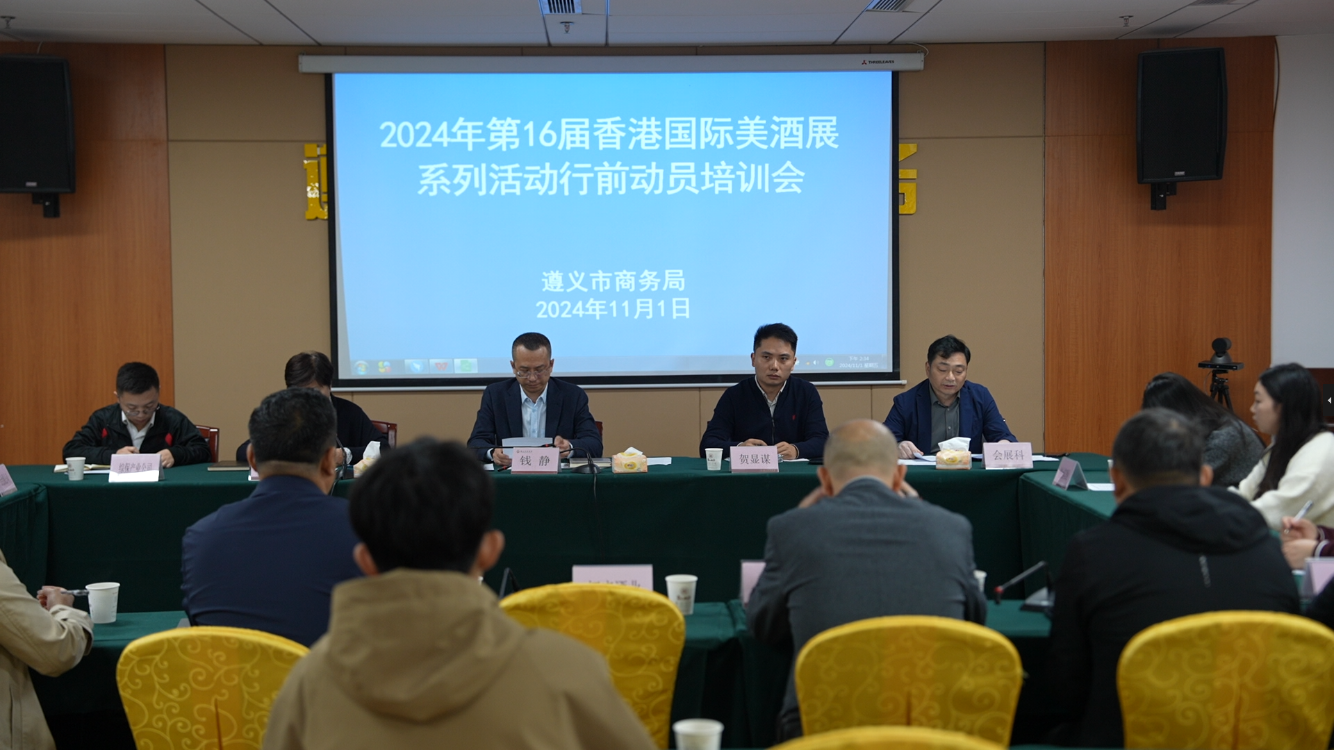 11月1日,2024年第16届香港国际美酒展系列活动行前动员培训会在贵州遵义举行。贵州省商务厅、遵义市商务局、遵义综保区、贵州广告会展公司,以及17家遵义名优白酒企业参会。培训会就系列活动期间,遵义白酒展览展示、贸易投资等方面进行商议和部署。