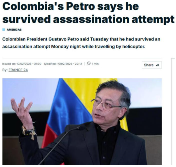 据法兰西24电视台报道,当地时间10日,哥伦比亚总统佩特罗表示,他数小时前逃脱了一起暗杀企图。
