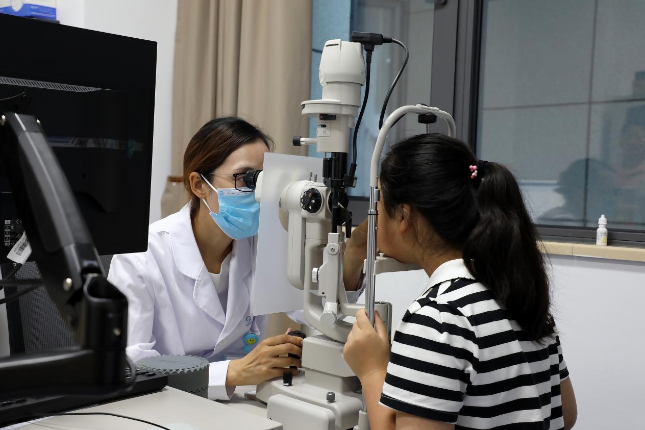(上海儿童医学中心贵州医院眼科副主任医师崔元玥为患儿检查眼睛)