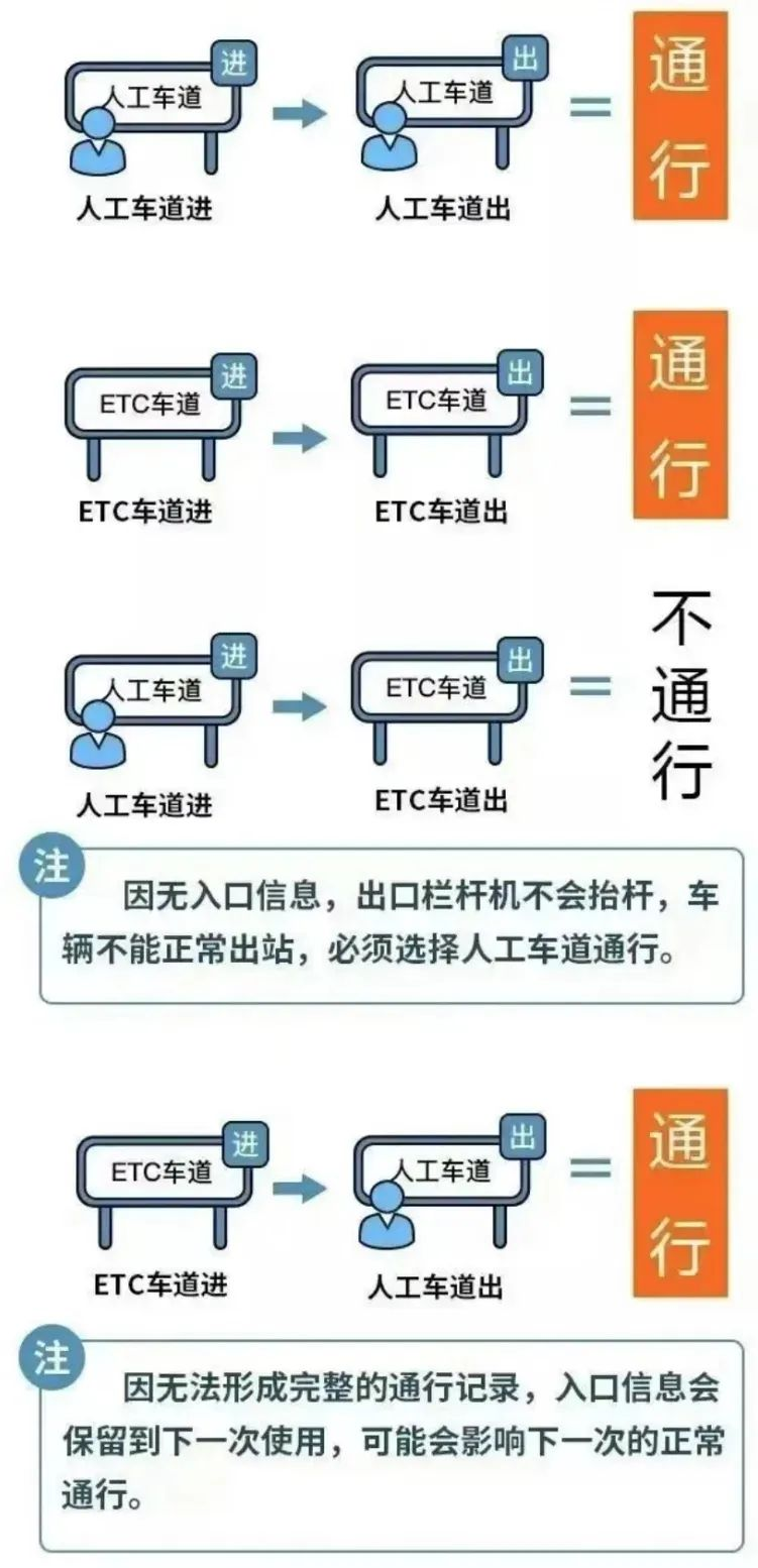 通过人工通道(包括人工/ETC混合车道)驶入高速的车辆,不建议在ETC车道下高速。因没有入口信息,出口栏杆机不会抬杆,只能人工重新录入信息,流程缓慢,影响通行效率,建议各位车主尽量选择同一类型车道(即在哪种通道上的就在哪种通道下),以免造成不必要的麻烦,尤其是ETC车辆。