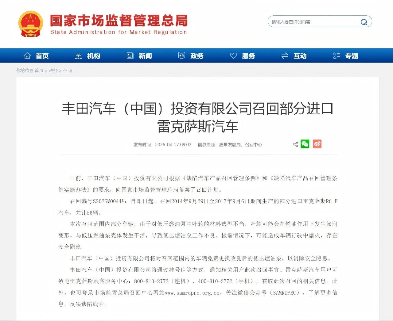 车召回编号S2026M0044V:自即日起,召回2014年9月29日至2017年9月6日期间生产的部分进口雷克萨斯RC F汽车,共计56辆。