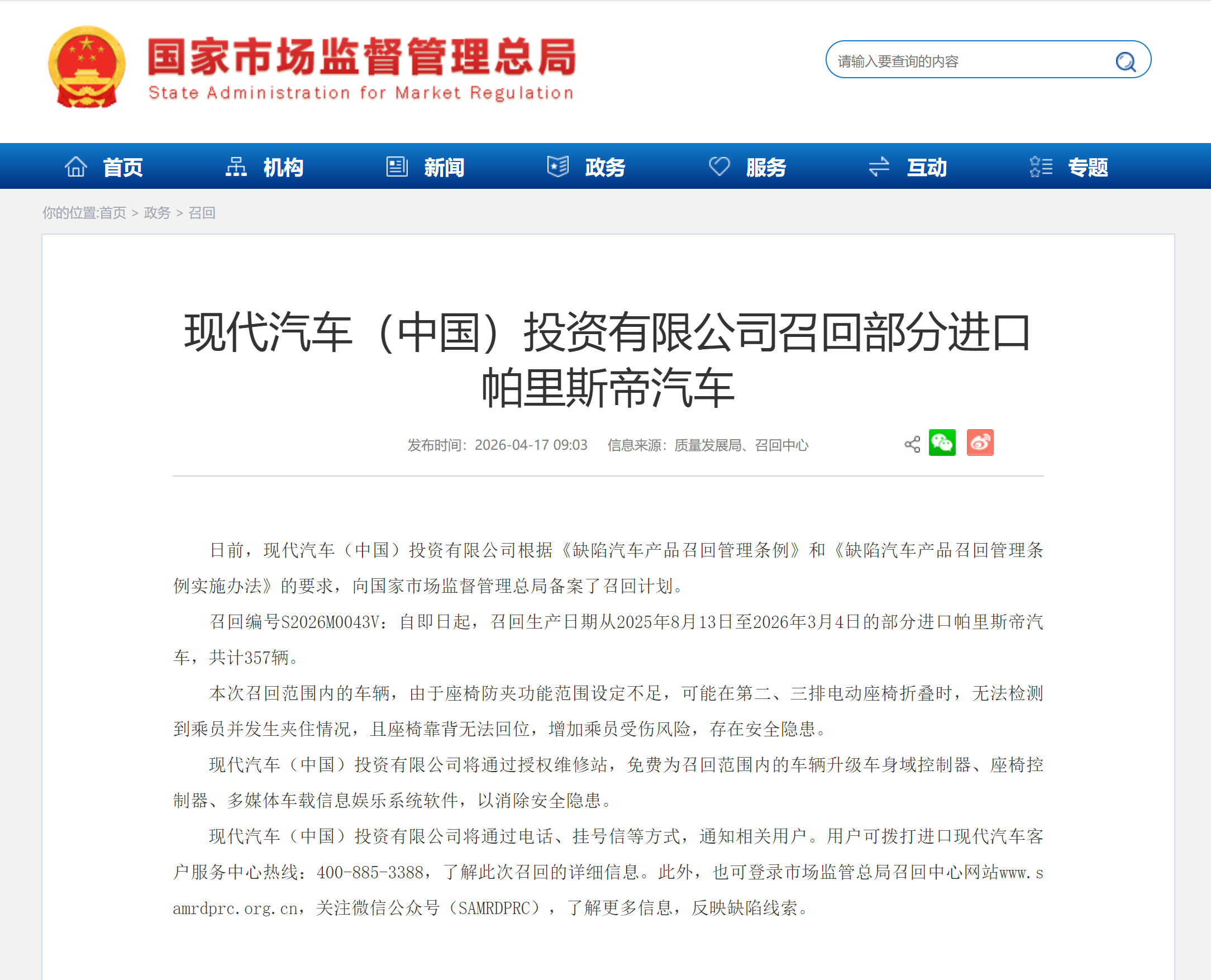 召回编号S2026M0043V:自即日起,召回生产日期从2025年8月13日至2026年3月4日的部分进口帕里斯帝汽车,共计357辆。