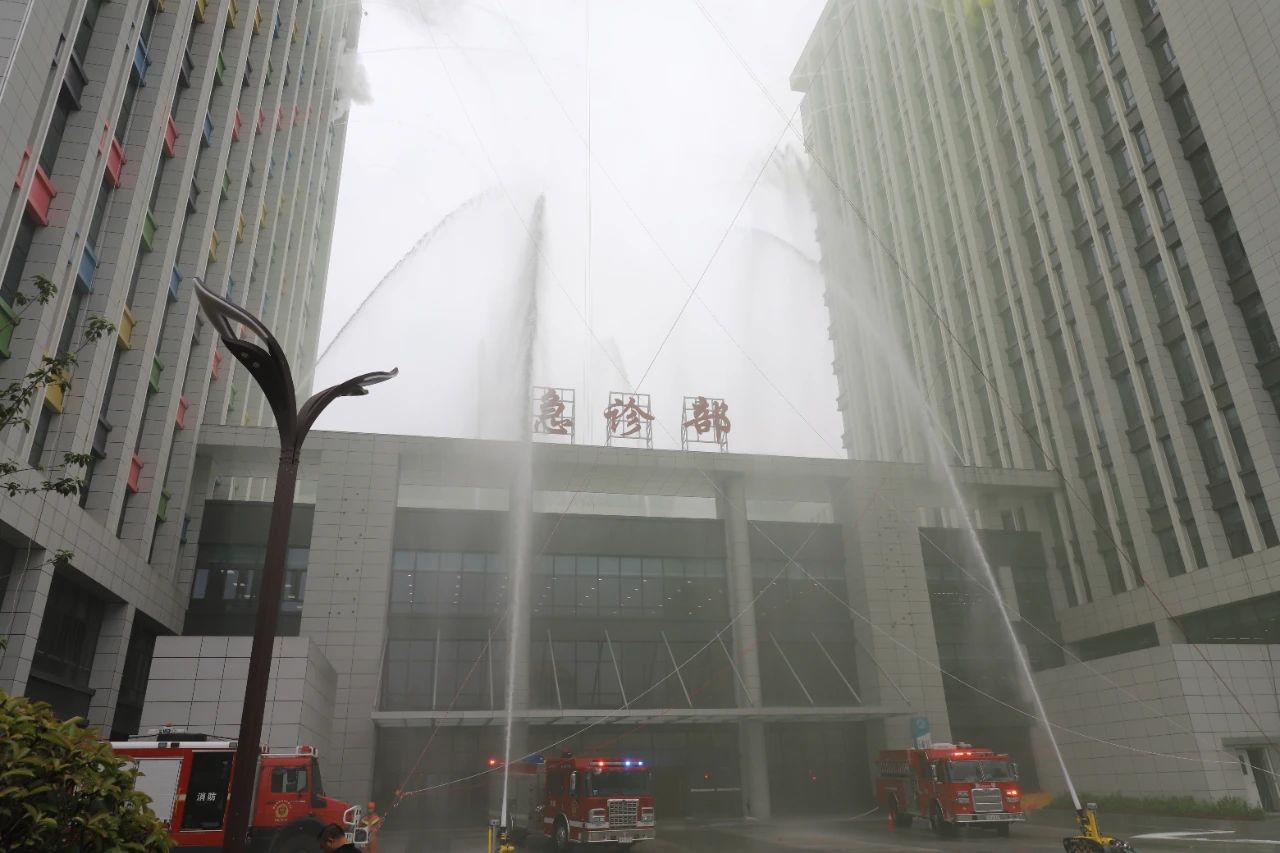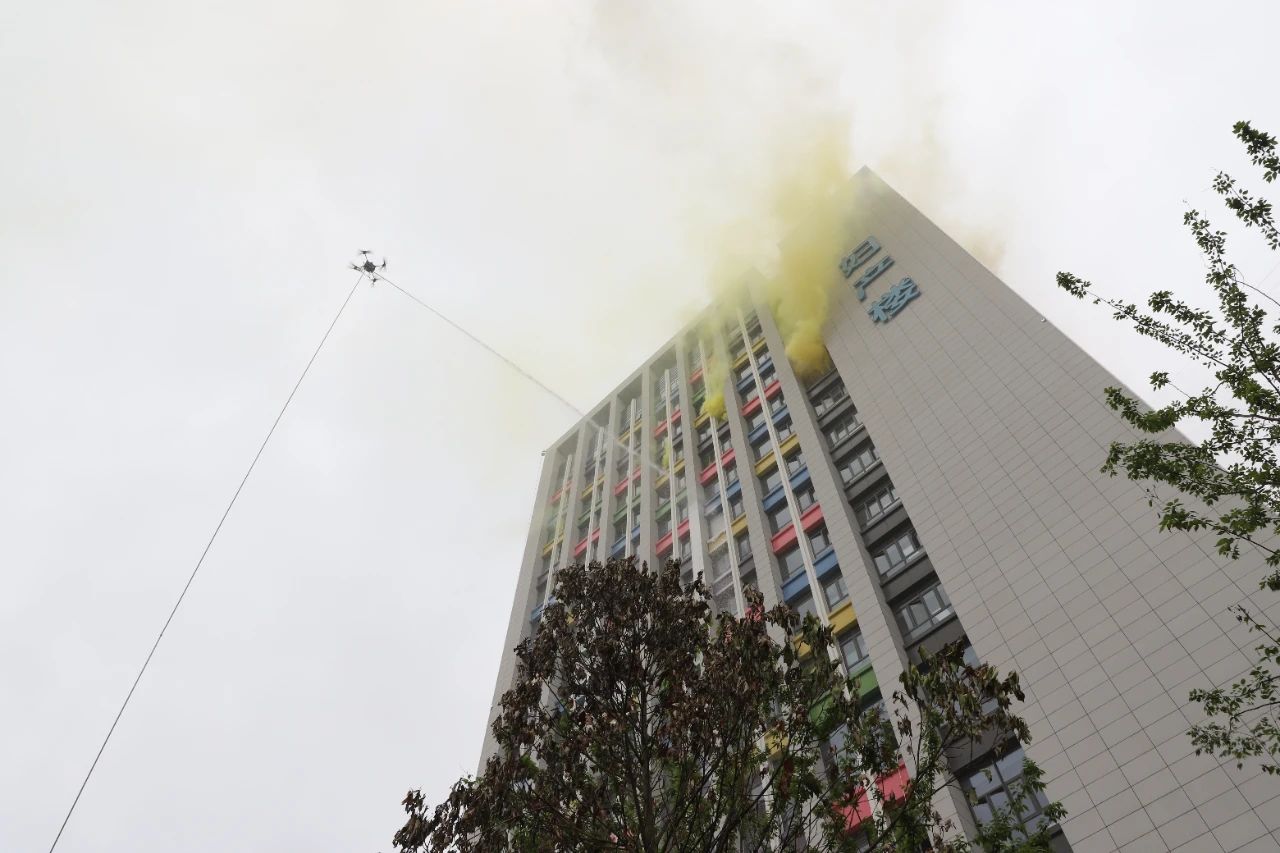 演练模拟医院高层建筑因施工发生火灾,室内医疗物资、装修材料、生活用品等可燃物较多,火势发展迅猛、并产生大量浓烟,火势有向上一楼层蔓延趋势,严重危及住院病人、医护人员生命和财产安全,现场情况十分严峻。火灾烟雾立即触发楼层内部感烟探测器,消防控制室值班人员利用火灾报警系统,确认灾情位置的同时调派医院微型消防站力量前往处置,并拨打119报警电话请求消防救援力量到场救援。119指挥中心接到报警后,根据报警人员的描述,迅速调派距离医院最近的消防救援站快返分队前往处置。随即,119指挥中心将灾情上报总队、市政府,并调派高层建筑灭火专业队各个战斗模块前往处置,同步通知支队全勤指挥部、应急通讯保障分队、战勤保障模块进行出动,同时启动《贵阳市重特大灾害事故应急救援预案》,应急、公安、交警、卫健、住建、环卫、气象、环保、通信等联动单位赶赴现场,协助处置。经过协同作战,被困人员成功转移,火势迅速被扑灭。