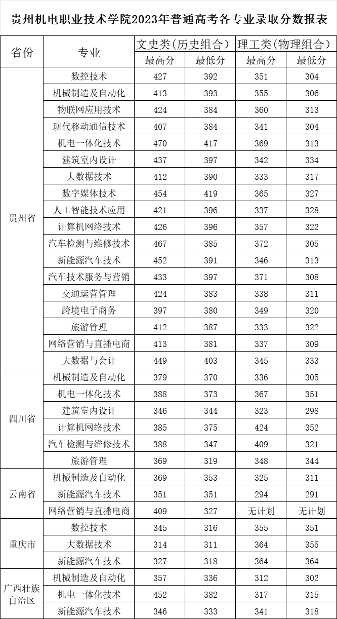 填报参考:贵州机电职业技术学院2023年在贵州省文史类最低投档分数线为395分,理工类最低投档分数线为318分。文史类录取的最高分470分,接近二本线,理工类最高是372分,超过二本线。为给考生做好服务,学院于2024年6月25日发布了2023年各专业的录取情况及2024年的招生计划,大家可以登录贵州机电职业技术学院官网、微信公众号查询。