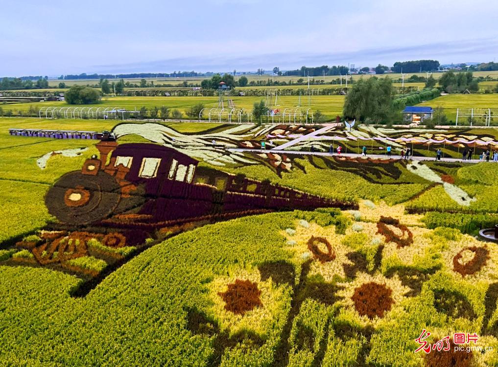 2022年8月28日,辽宁省沈北新区兴隆台锡伯族镇兴光村稻梦空间,巨型"稻田画"构成一幅田园美景画卷。彩色水稻,结合锡伯族文化特色,利用色彩及三维等方式打造的巨型稻田画,让水稻以艺术的姿态呈现,成为辽宁乡村旅游的一张靓丽名片。(王昊 摄)