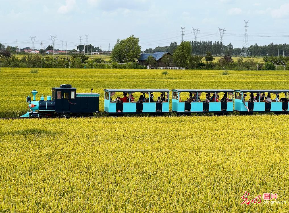 2022年8月28日,辽宁省沈北新区兴隆台锡伯族镇兴光村稻梦空间,游客乘小火车游玩。(王昊 摄)