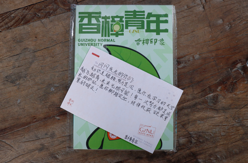 贵州师范大学实践队成员给肇兴中学同学带来的印有“香樟青年”LOGO的笔记本以及亲笔书写的明信片