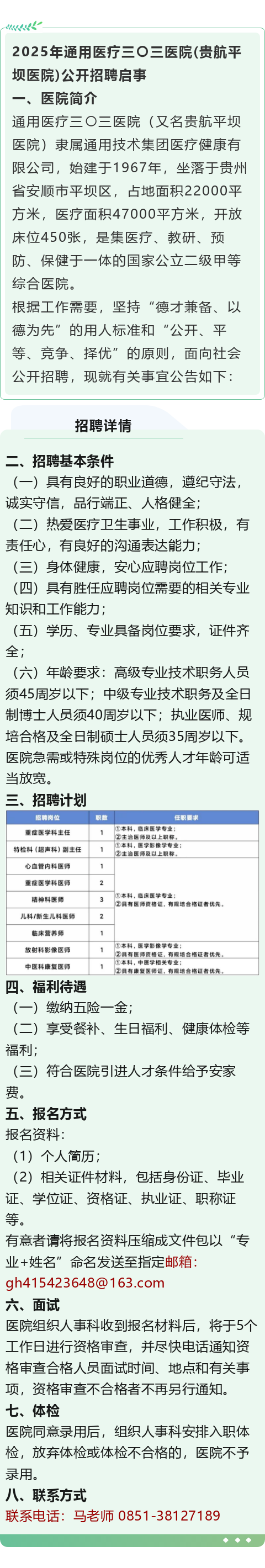 通用医疗三〇三医院9岗招聘!五险一金+餐补等福利!