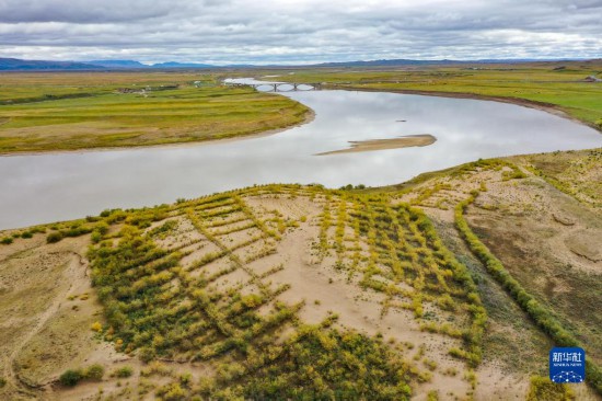 这是黄河玛曲段干流沿岸一处流动沙丘修复治理工程(9月17日摄,无人机照片)