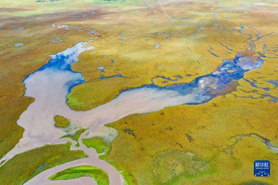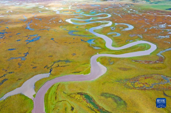 这是玛曲县阿万仓湿地内的一处沼泽(9月17日摄,无人机照片)