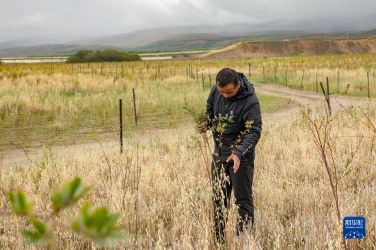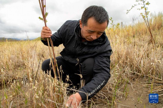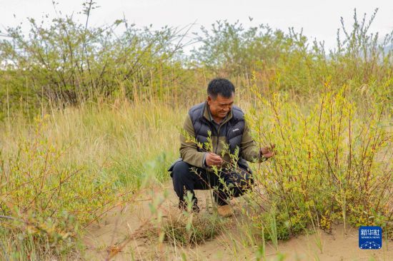 牧民卓玛加布在黄河玛曲段干流沿岸一处沙丘上查看他参与种植的灌木生长情况(9月16日摄)