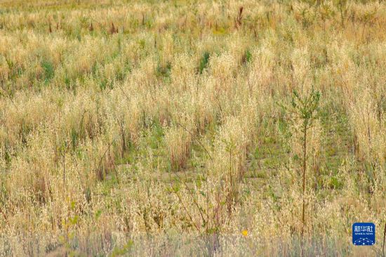 这是黄河玛曲段干流沿岸一处阻沙林带建设区域的草方格沙障内的植被(9月16日摄)