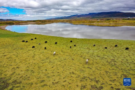 牛群和马在黄河玛曲段干流沿岸的一处草地上吃草(9月17日摄,无人机照片)。玛曲县在2019年就实现了草畜平衡。