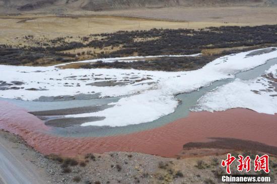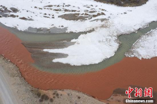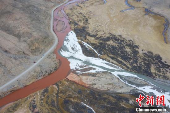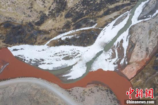 3月中下旬,青海省海西蒙古族藏族自治州都兰县,航拍两条河流在香加乡洪水川交汇处出现的"泾渭分明"景观。