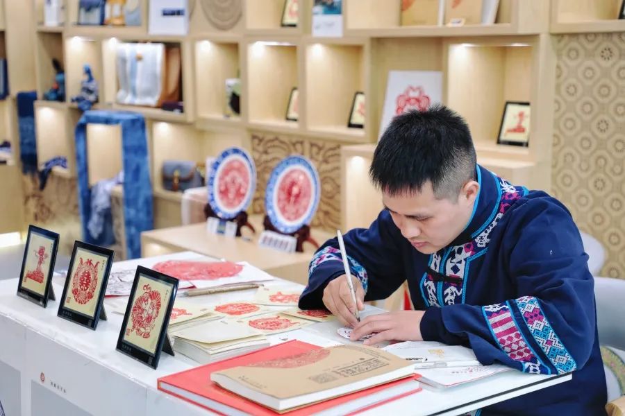铜仁市级非遗传承人王再臣介绍,这是非遗项目——思南土家族剪纸,这种剪纸将北方豪放简练的简刻与南方精巧秀美的繁刻兼收并蓄,以插刀、转刀、拖刀为主要技法进行雕刻创作。为了适应现代消费者的需求,他们专门开发了这种低门槛的活动项目,老少皆宜。今后,不仅能在贵州各大景区体验到,在贵荟馆·贵京荟内也有非遗传承人驻场并教授,开展常态化活动,推广非遗。