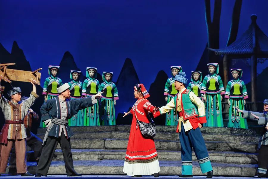 除了感人的故事,剧中贵州秀丽的山川、多彩的民族风情、独特的喀斯特地形地貌被“搬”上了舞台,借助灯光音效宛如一幅淡雅的水墨国画徐徐展开。