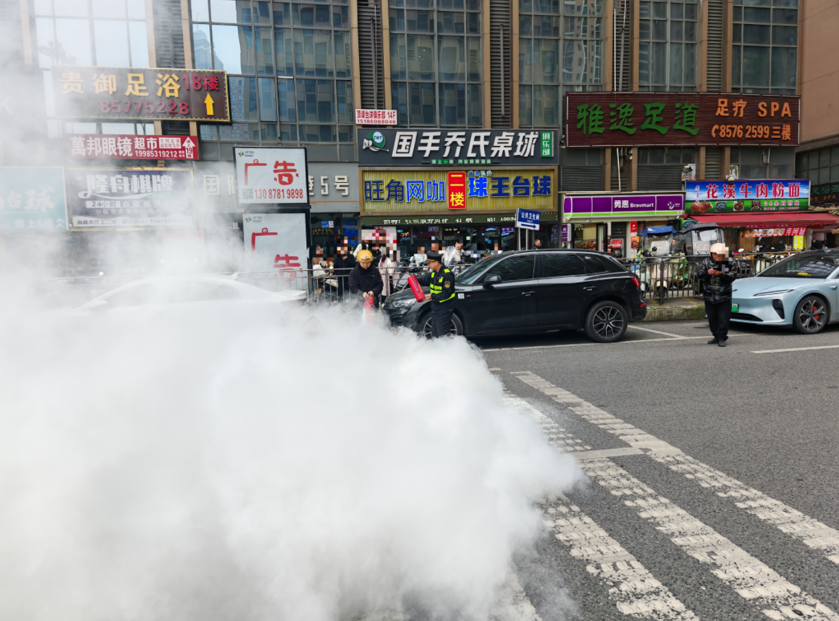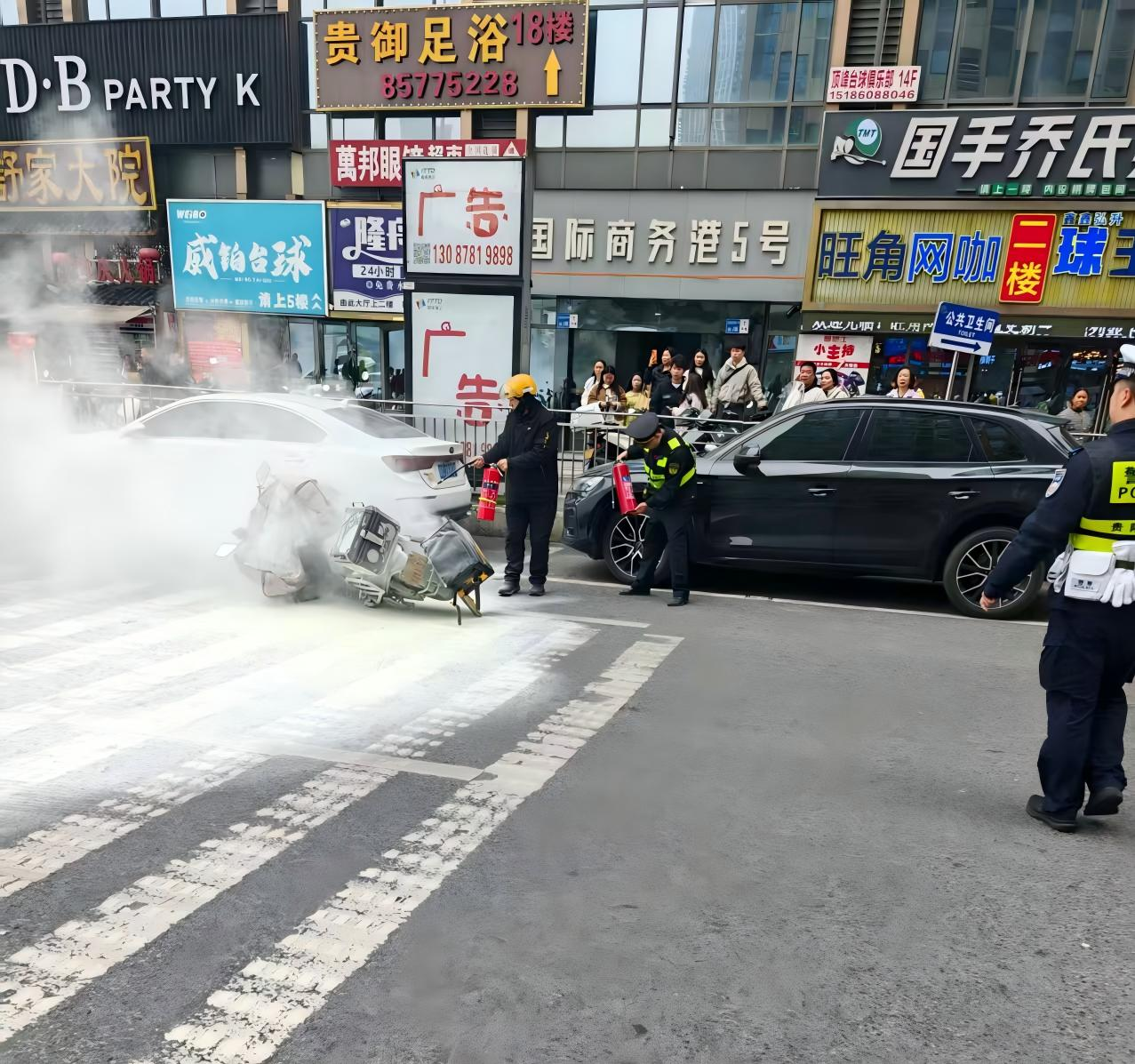 事发时,执法队员巡逻至花果园J区路段,发现一辆电瓶车正冒烟起火,火势蔓延迅速。车主试图将车辆移至路边,队员见状立即上前,第一时间将车主拉离至安全区域,随后就近取用灭火器进行扑救,同步疏散围观群众、维护现场秩序。火势在几分钟内被完全扑灭,仅车辆受损,未造成人员伤亡。事后初步判断,起火原因疑为电瓶内部短路。