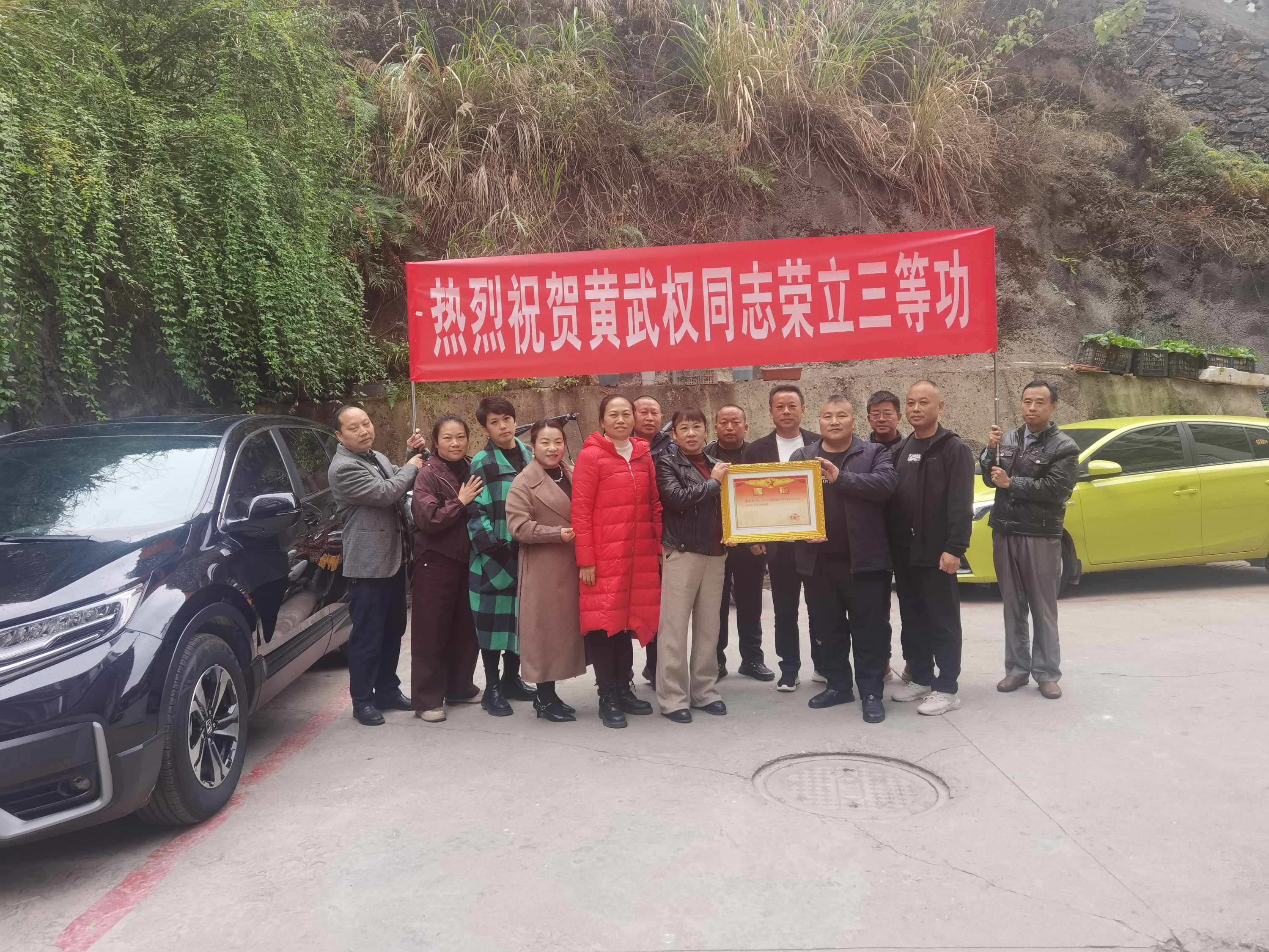 “热烈祝贺黄武权同志荣立三等功”,送喜队伍手捧立功喜报,来到黄武权的家中,为黄武权父母披上荣誉绶带,将喜报送到他们手上,向他们致以热烈的祝贺。