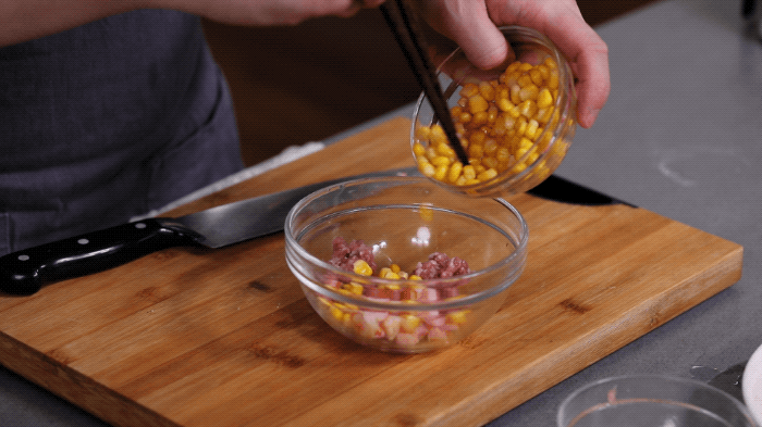 2.虾仁玉米馅:虾粒中加入腌制好的肉末、玉米粒,搅拌均匀备用。