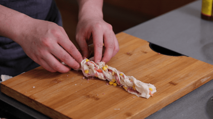 2.用刀将手抓饼卷切成三股,用编辫子的方式编成花环状。