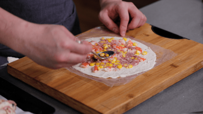 1.将馅料均匀涂在解冻后的手抓饼上,将手抓饼卷成一个卷。