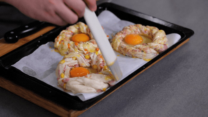 1.在花环饼中间打一个鸡蛋,饼上刷上蛋液。