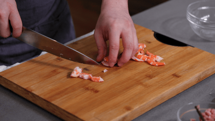 2.虾汆烫后去壳,切成小粒备用。