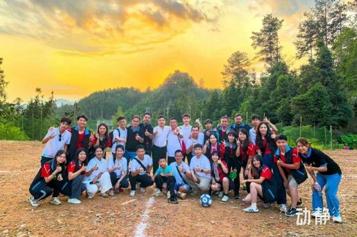 当佛山、澳门的青年得知这一消息后,他们迅速进行沟通对接,决定伸出援手。利用活动的间隙,他们与当地村干部一起挖除杂草、铲平地面、拼装球门、绘制球线。在大家的共同努力下,一个位于高山之上的“村超”足球场顺利建成。来自粤港澳黔四地的青年代表,共同为这个球场画上了寓意团结与梦想的“同心圆”,并在此成功举办了首场属于田懂村的“村超”足球赛。比赛中,来自大湾区的青年与当地青年跨越千里,以足球为媒介,进行了一场友谊赛,他们通过足球交流情感、联结心灵,共同书写了青年助力乡村振兴的新篇章。