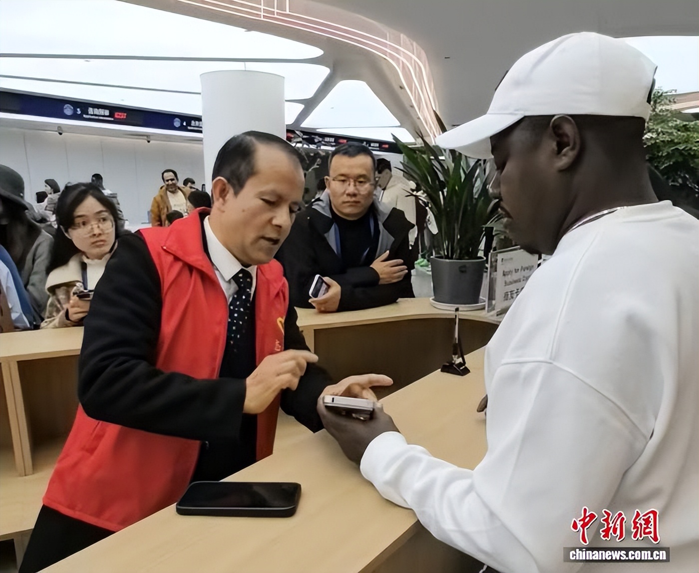 在浙江省义乌市国际贸易服务中心的大厅里,前来办理续签等业务的外国人络绎不绝。与一般政务窗口不同,这里活跃着一群身穿红色马甲的外籍志愿者,正用不同语言为他们提供引导和咨询。