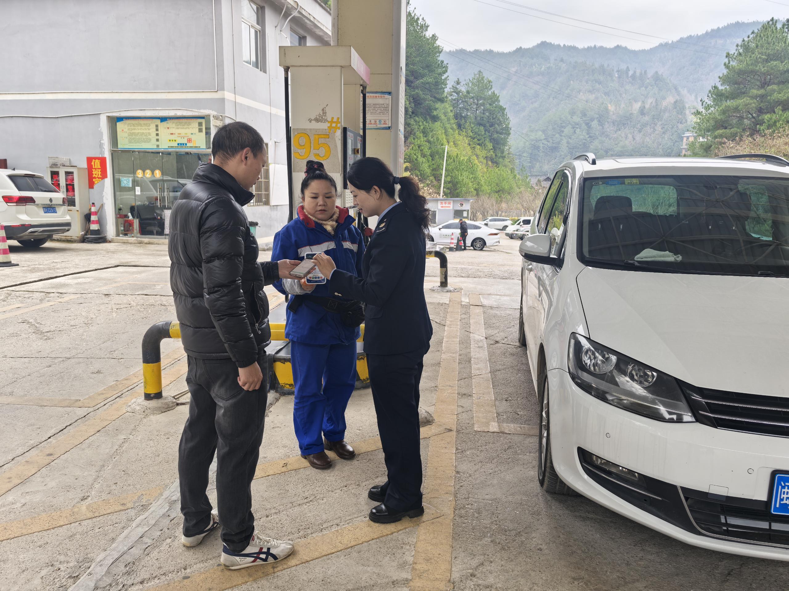 (税务干部在试点加油站辅导车主张梅接收发票)
