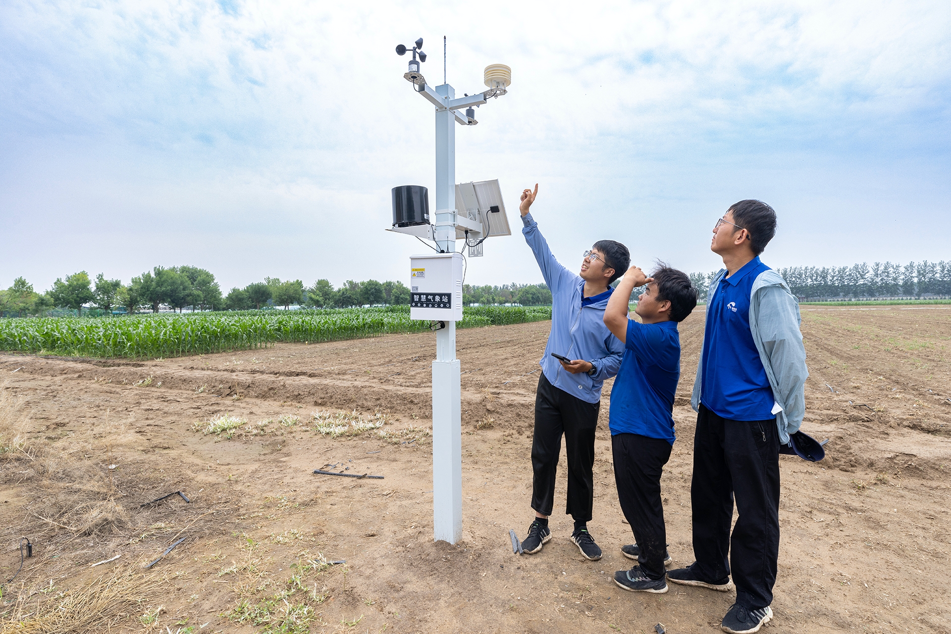 在北京玉米新品种智慧展示园里,夏浩然(左一)正和团队查看智慧气象站在田间的运行情况。张寅生 摄