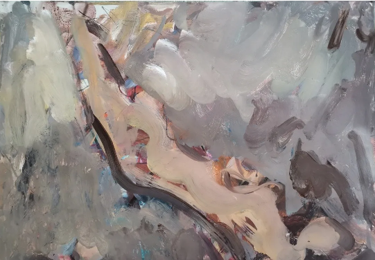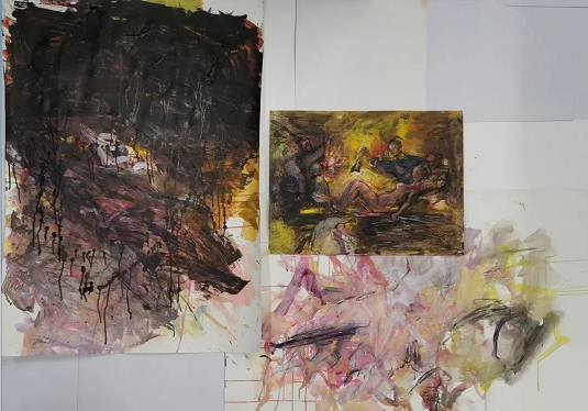 近期这些作品的表面是涂绘性的。所谓“涂绘”(smear over 或者painting),即如新手胡涂乱抹而来的线的直接涂划以及不同线与色彩之间的相互覆盖与交叉,营造出非素描亦非平面的自由图像,它们一堆堆如色彩调性不同的杂物一般,堆积在画幅当中,有些是几乎完全的相互覆盖,有些是团块渲染与颤抖线形的具象交织,又有一些如草图那样尝试着去试探形象的隐藏与显形之间的平衡与冲突。