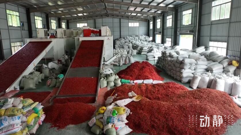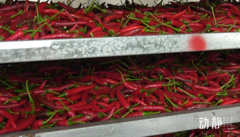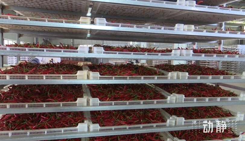 在德江县复兴镇的贵州徐源辣椒实业有限公司车间内,一车车采摘好的辣椒从田间运到工厂,2台大型网袋式空气能烘干机上铺满了鲜椒,辣椒在流水线上源源不断地进出,一袋袋打包好的辣椒整装待发,准备运往省内外市场。