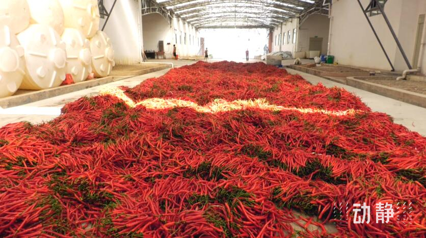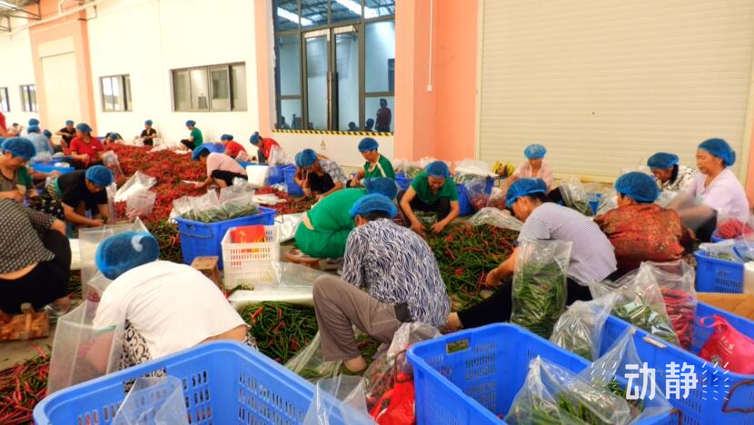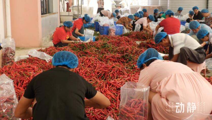 这段时间是辣椒采收和加工生产的高峰期,在贵州和记绿色食品开发有限公司内,翠绿、火红的辣椒堆积如山,60余位工人忙着将辣椒进行挑选、装袋、过秤。
