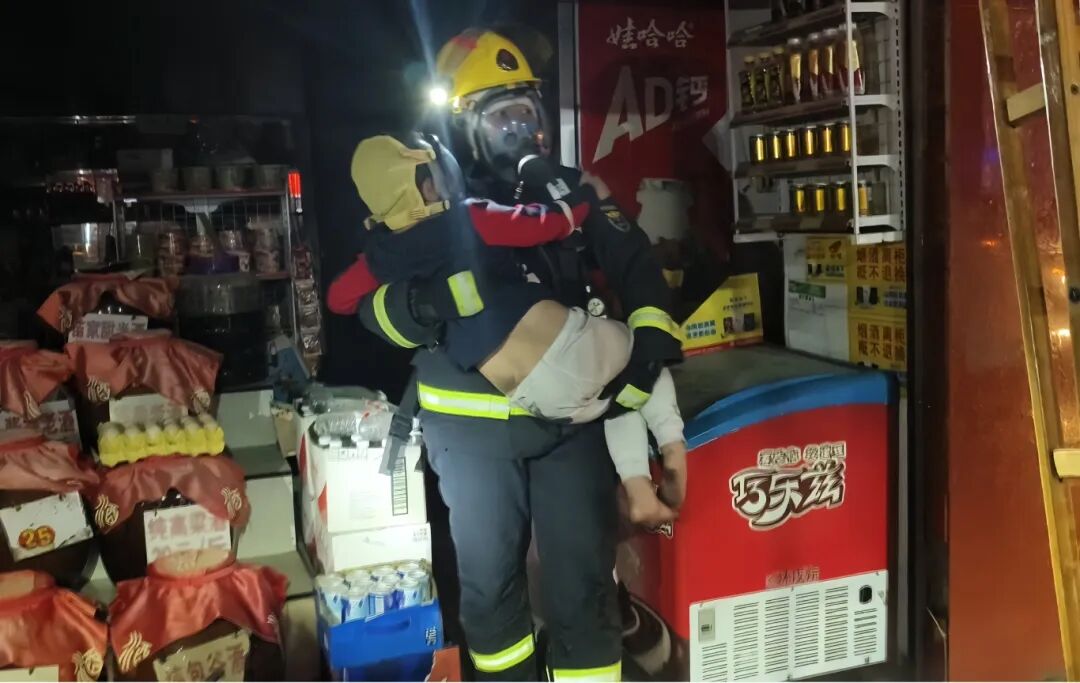 接到报警后,当地消防救援队伍迅速赶赴现场。抵达后,消防员即刻分组处置:一组携带救生面罩冲入浓烟楼道搜救被困人员,另一组快速铺设水枪阵地,对准一楼起火店铺扑救,全力压制火势蔓延以保障搜救安全。