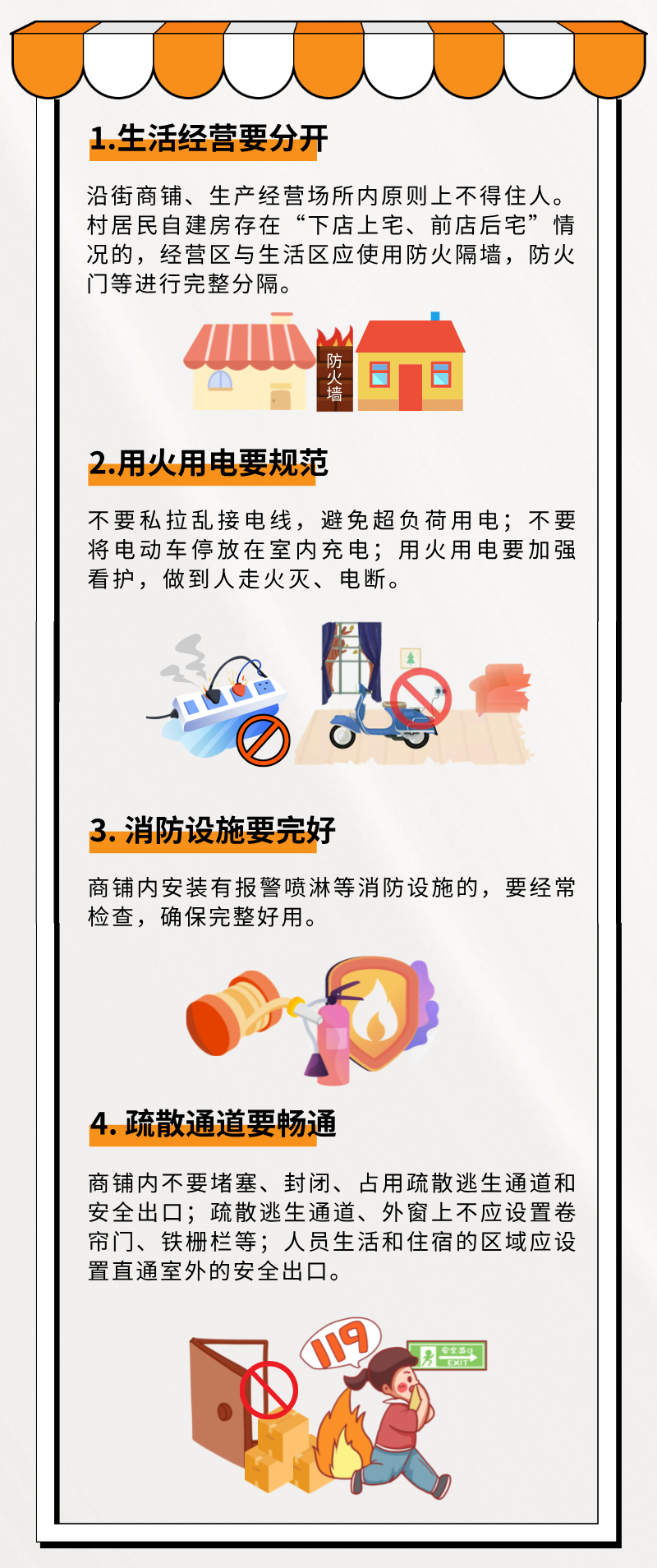 3.商铺有的会通过增设夹层、隔间等方式,将住宿的生产、仓储、经营场所设置在同一建筑内,加之人员缺乏基本的逃生常识,在火灾面前难以准确快速自救,导致了悲剧的发生。