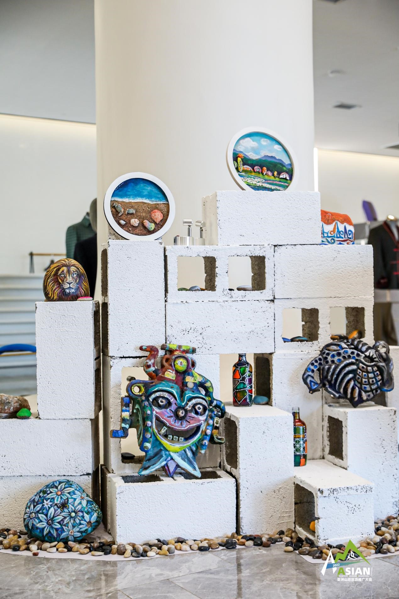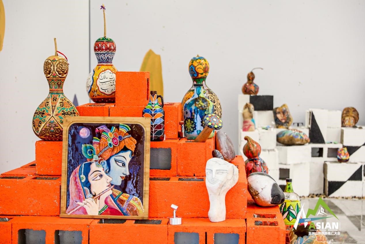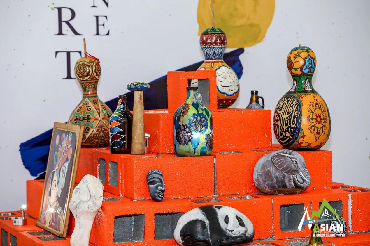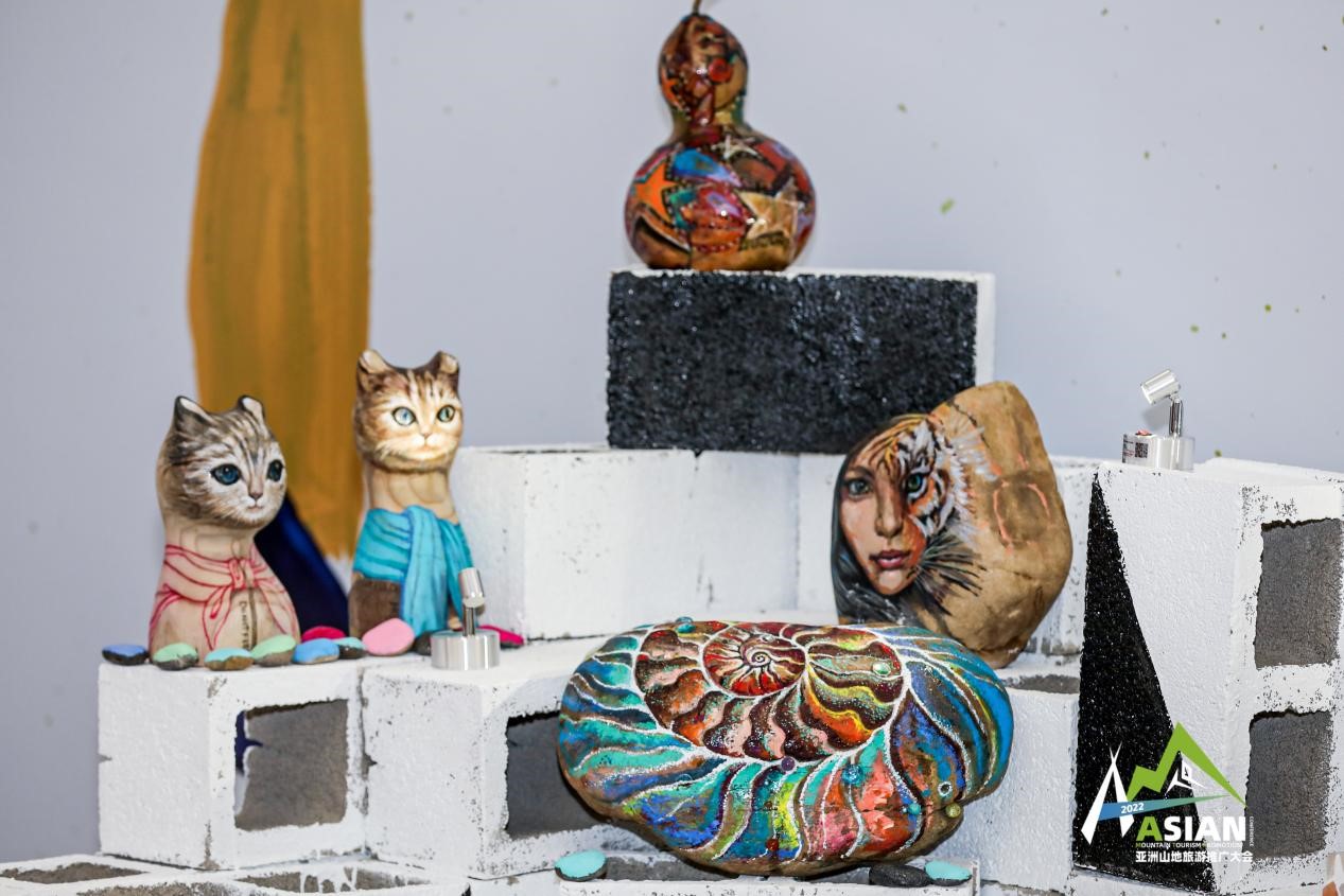 作为本次山地艺术空间展的策展人,贵州索玛文化总经理姜先生介绍,“山地之美,从一块石头开始发现”板块里所有摆放的作品都由在海外的贵州籍艺术家专门为这次大会赶制的,所用材料全部都是很平常、很普通的用品。“贵州山地多,所以河边、山上随处可见各种石头,这些石头都是很普通很普通的,我们的艺术家就在上面作画,利用石头的形状和纹理来绘制不同的动物;家里平时广泛使用的瓶瓶罐罐,用完之后就在上面作画,色彩和颜色都是很现代的;我们还在菜板上作画,就是家里不用的菜板,拿过来在上面绘制,而且融入了印度的元素,也正好契合了亚洲山地旅游推广大会的主题。就连我们摆放展品的展台都很特别,是我们贵州当地的空心砖,用防水防火的涂料刷成了橙红色,一个非常醒目且很有生命力的颜色。”